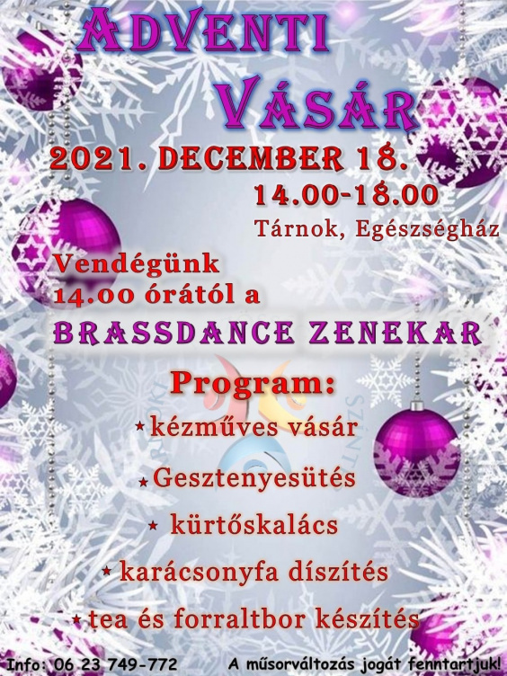 December 18-án délután kettő és hat óra között adventi vásárt tartanak a tárnoki egészségházban. A vásár védettségi igazolvány nélkül látogatható, az orrot, szájat eltakaró maszk viselése ajánlott.