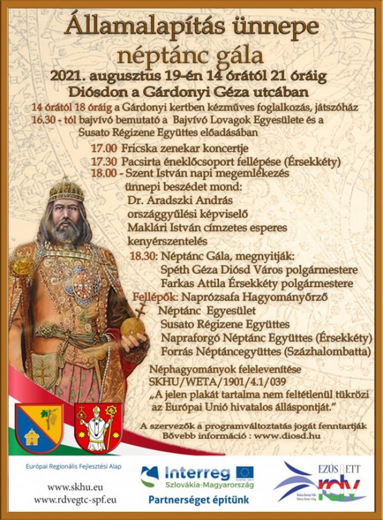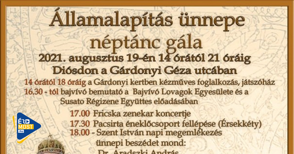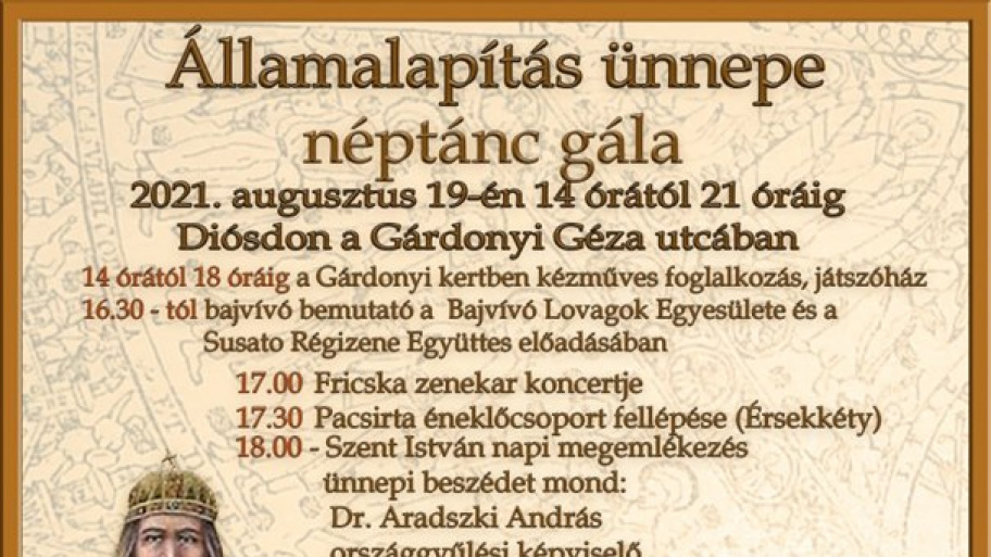 2021. augusztus 19-én Szent István napi megemlékezést tartanak Diósdon, melyet néptánc gála követ. 14 órától a legkisebbeknek kézművesfoglalkozás és játszóház lesz a Gárdonyi kertben, majd kulturális programok várják az érdeklődőket az Államalapítás ünnepe alkalmából.