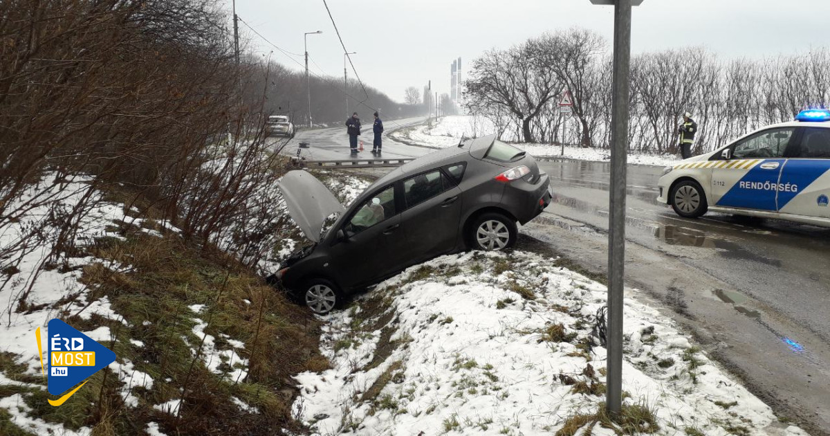 Közvilágítási oszlopnak ütközött, majd az árokba csapódott egy személygépkocsi szombaton délben Százhalombattán, a Csenterics Sándor úton.