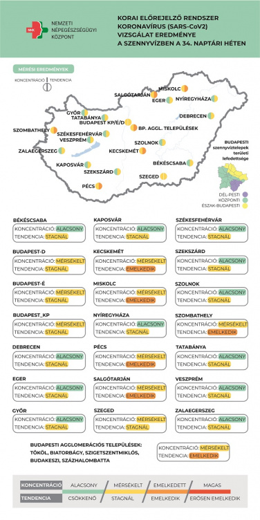 A 34. héten több nagyvárosban határozott növekedésnek indult a koronavírus koncentrációja. Emelkedés figyelhető meg a budapesti agglomeráció vizsgált városaiban (Tököl, Biatorbágy, Szigetszentmiklós, Budakeszi, Százhalombatta), Kecskeméten, Miskolcon, Pécsen, Salgótarjánban és Szombathelyen.