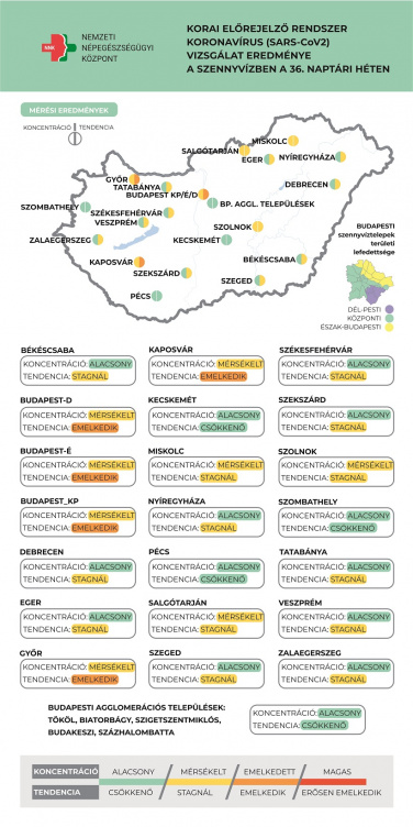 A szennyvízminták koronavírus-koncentrációja hosszabb időtávot tekintve lassan emelkedik, míg a heti mérési eredmények jellegzetes ingadozást mutatnak. Az egyes városok szennyvízmintái közül aktuálisan növekszik Budapest, Győr és Kaposvár, míg csökkenés tapasztalható a budapesti agglomerációs települések (Tököl, Biatorbágy, Szigetszentmiklós, Budakeszi, Százhalombatta) közös mintája, továbbá Kecskemét, Pécs és Szombathely esetében. A vizsgált városok többségében (14 helyen) továbbra is alacsony a víruskoncentráció, míg 8 mintavételi helyen a mérsékelt tartományba esik - tájékoztat az NNK.