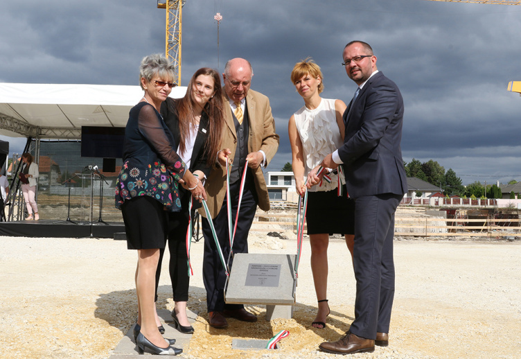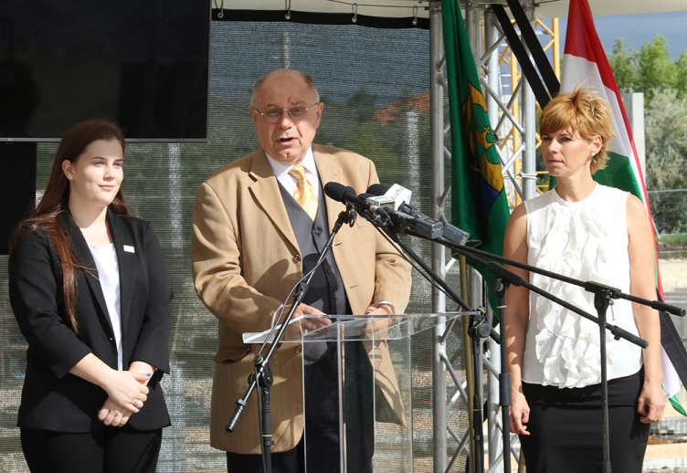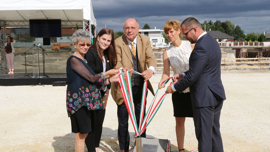 – Nem tudom, hogy azok, akik ennek az ellenkezőjét állítják, elfogadták-e a meghívást erre a mai ünnepi eseményre. Ha igen, ők is láthatják a saját szemükkel, hogy Érd épül és gyarapodik! Mégpedig azért, mert tizenkét évvel ezelőtt új várospolitikát hirdettünk. Azok, akik azt mondják, hogy Érden nem történik semmi, nos, ők pártpolitikát képviselnek. Mi várospolitikát hirdettünk 2007-ben, amelynek a Batthyány Program nevet adtuk, s ennek vált később szerves részévé a Modern Városok Programja. Az a program, amelynek ötlete innen, Érdről indult el, s amely sok városnak az országban, így Érdnek is elhozta az évtizedek óta várt lehetőséget a fejlődésre. 2015 nyarán Orbán Viktor miniszterelnök úrral végigtárgyaltuk az Érdet érintő terveket, víziókat. Végigvettük a Batthyány Program által megfogalmazott fejlesztéseket, mindazt, amivel ez a város a rendszerváltás óta adósa az itt élőknek. Az ünnepélyes aláírást követően elindulhatott a munka. A tervezés, a pályáztatás, a szerződéskötések, és végül az építkezések. Ennek egyik eleme a Fenyves-Parkvárosi Köznevelési Centrum, amelynek építkezése már zajlik, mint látják, és amelynek az alapkövét tesszük most le. Ez az építkezés és a leendő intézmény környezete szimbolizálja mindazt, amit Érd jövőjéről elképzeltünk. Nemrég adtuk át ezt az új, európai színvonalú óvodát, amely mellé hamarosan egy bölcsőde is épülhet. Ezeket megelőzően a Járási Hivatalt, a Tankerület épületét, az új rendőrséget építettük meg, s már épül a záportározó, a városliget és még sorolhatnám. 2020-tól pedig általános iskola, majd új középiskola várja a diákokat. Vagyis mindazok, akik itt, ebben a hamarosan csodás környezetben szeretnék taníttatni a gyermeküket, a bölcsődétől az érettségiig megtehetik ezt anélkül, hogy el kellene hagyniuk a várost. Ha arra gondolunk, hogy tíz éve mindössze egy gimnázium és egy szakmunkásképző volt a városban, most pedig az ötödik középiskolája épül Érdnek, akkor mindenki számára nyilvánvalóvá válik, hogy Érd épül és gyarapodik – hangsúlyozta T. Mészáros András, aki megkérte Lázár Evelint, az Ifjúsági Önkormányzat polgármesterét, és Takács Éva háromgyermekes édesanyát, lépjenek mellé.