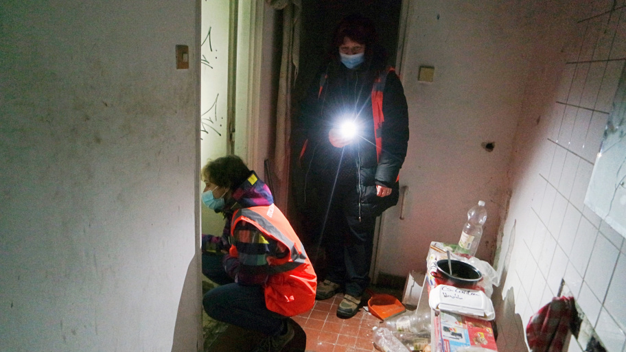 Szürke hétköznap délután. Nulla fok, de nem esik. Szerencse, mert jó pár órát kint töltök a szabadban: a Szociális Gondozó Központ utcai gondozó szolgálatának munkatársait kísérem, akik a téli időszakban munkanapokon délután kettő és este tíz óra között, autóval vagy gyalogosan járják az utcákat, tereket, felkeresik az Érd, Tárnok és Diósd közterületein élő fedél nélkülieket. Rendszeresen látogatnak rossz minőségű ingatlanokban élőket is. A sokszor fűtés és vezetékes víz nélküli romos épületek lakói a hajléktalanokhoz hasonlóan kiszolgáltatottan élik mindennapjaikat, az utcai léttől csak egy kerítés választja el őket.