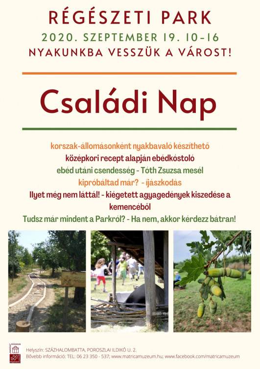 A rendezvényre Százhalombatta várossá nyilvánításának 50. évfordulójának apropóján kerül sor. A szervezők a családok minden tagját megmozgató és lekötő programokkal várják az érdeklődőket. A kézműves foglalkozásokon több korszakot is megjelenítenek, nyakbavalókat készítenek. Lesz élőszavas népmesemondás és a gasztronómia sem marad el: őskori finomsággal készülnek, ami azt jelenti, hogy csak olyan alapanyagok kerülhetnek a bográcsba, amelyek az őskorban is adottak voltak. A parkot is meg lehet ismerni játékos formában.