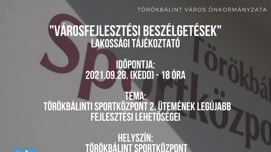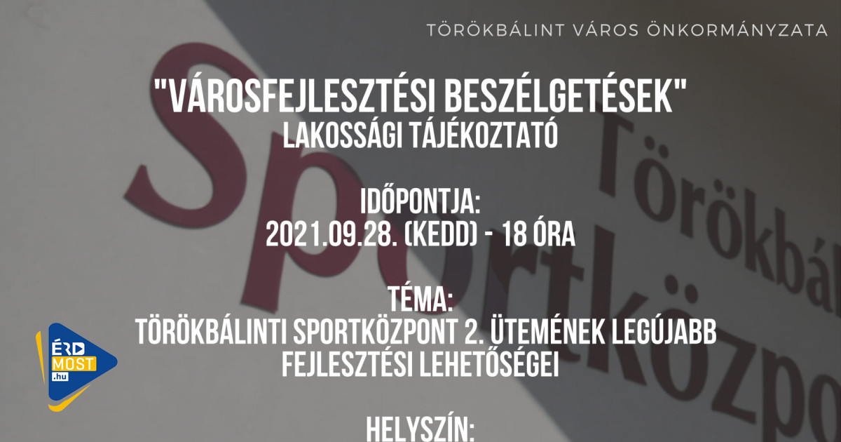 A városfejlesztésről kezdeményezett programsorozat első állomásán a Törökbálinti Sportközpont közel 15 éve tervezett második ütemének legújabb fejlesztési lehetőségeiről esik szó, helyszíne a Törökbálint Sportközpont (2045 Törökbálint, Óvoda utca 6.) Zsolnai József terem lesz.