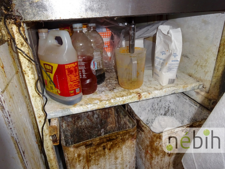 Az étterem üzemi területén általános volt a takarítatlanság, nyílászárók, a padozat, a munkafelületek, a polcok, de még az edények, az eszközök és a villanykapcsolók is rendkívül szennyezettek, tisztítatlanok voltak. Több helyen szennyezett, undort keltő textilrongyot találtak az ellenőrök. Az élelmiszerek tárolásával is akadtak gondok: közös hűtőtérben tároltak eltérő higiéniai megítélésű élelmiszereket (pl. friss hús, konzerv, zöldség, főtt tészta), de számos esetben közvetlenül a padozaton tárolták az élelmiszereket. A külvilágra nyíló ajtót leszerelték, azt az udvaron, a falnak támasztották. Helyette csupán egy acélkeretre rögzített, sérült rovarhálójú ajtót szereltek fel úgy, hogy az ajtó és a fal közt akkora rés volt, hogy azon a kártevők akadálytalanul bejuthattak.