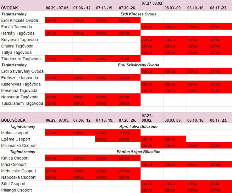 Közérdekű2020. február 02. 13:28erdmost.huA bölcsődék és óvodák nyári nyitvatartási rendjeA január 30-ai közgyűlésen a testület döntött az önkormányzat által fenntartott, érdi bölcsődék és óvodák nyári nyitvatartási rendjéről.