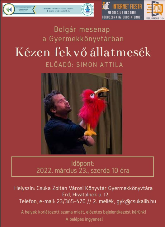 Programajánló2022. március 18. 17:13erdmost.huBolgár mesenap lesz szerdán a könyvtárban Március 23-án, szerdán, 10 órától Bolgár mesenapot tartanak a Csuka Zoltán Városi Könyvtár Gyermekkönyvtárában. Az előadás ingyenes, de a helyek korlátozott száma miatt előzetes bejelentkezés szükséges.