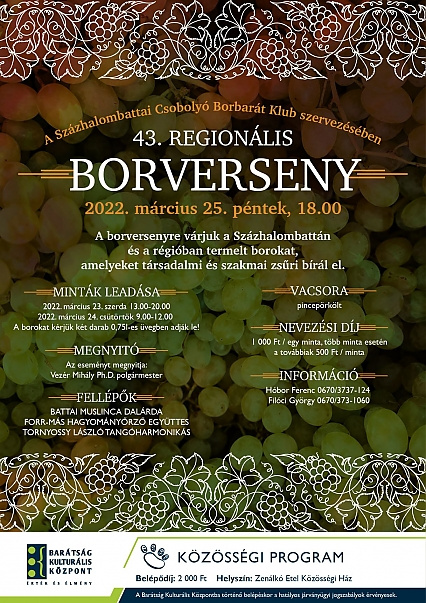 A Százhalombattai Csobolyó Borbarát Klub megrendezi 43. regionális borvesenyét, március 25-én, pénteken, 18 órától, a BKK-ban. A versenyre a Százhalombattán és a régióban termelt borokat várják, amelyeket társadalmi és szakmai zsűri bírál el.