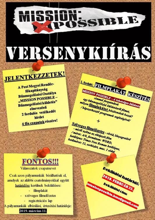 A Pest Megyei Rendőr-főkapitányság (Pest MRFK) „MISSION POSSIBLE - A lehetséges küldetés" elnevezésű pályázati projektje a második megvalósítási szakaszához érkezett. A Nemzeti Bűnmegelőzési Tanács által támogatott projekt következő programja a Bűnmegelőzési küldetés elnevezésű kétfordulós vetélkedő, melyre 4 fős Pest megyei középiskolás csapatok jelentkezését várja a Pest MRFK. A csapatokhoz egy-egy fő bűnmegelőzési előadó fog csatlakozni, mint csapatkapitány.