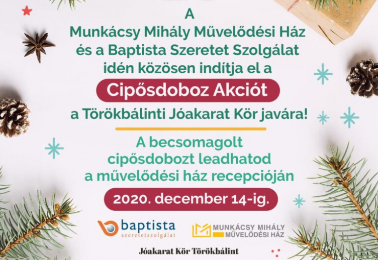 A megfelelően csomagolt cipősdobozokat 2020. december 14-ig várják a törökbálinti Munkácsy Mihály Művelődési Ház rendezvényszolgálatán. Az adományok célba jutását a Jóakarat Kör segíti.