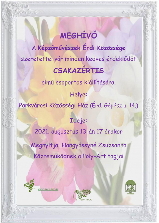 A kiállítást a Parkvárosi Közösségi Házban rendezik (Érd, Gépész u. 14.), a megnyitóra augusztus 13-án 17 órakor kerül sor, Hangyássyné Zsuzsanna, illetve a Poly-Art tagjainak közreműködésével. A megnyitóra szeretettel várnak minden érdeklődőt.