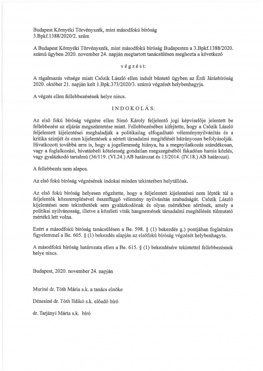 A három törvényszéki bíró által meghozott végzés indokolása szerint a feljelentett, tehát Csőzik László kijelentései “nem lépték túl a feljelentők közszereplésével összefüggő véleménynyilvánítás szabadságát” és “nem tekinthetőek sem gyalázkodónak és olyan mértékben sértőnek, amely a politikai nyilvánosság, illetve a közéleti viták hangnemének társadalmi megítélésén túlmutató mértékű lett volna.”