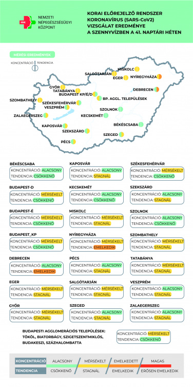A Nemzeti Népegészségügyi Központ tájékoztatása szerint a 41. héten elvégzett szennyvízvizsgálatokról szóló közleményében írja, “a szennyvízben kimutatható koncentrációnövekedés 4-10 nappal előzi meg a tünetes megbetegedések számának növekedését”, így a hatóságok szerint abból kimutatható a koronavírus-fertőzések jövőbeli felfutása.
