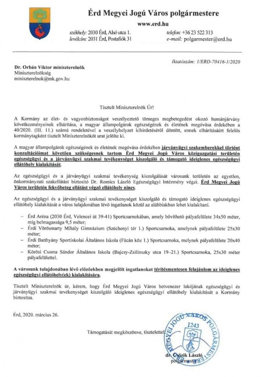 A városvezető szerint a ideiglenes egészségügyi ellátóhelyet lehet kialakítani az ÉRD Aréna sportcsarnokában, és a VMG, a Batthyány, valamint a Kőrösi iskola sportcsarnokaiban. Ezeket az ingatlanokat térítésmentesen ajánlja fel a polgármester a fenti célra, kérve a miniszterelnököt, hogy a kormány biztosítsa az egészségügyi ellátóhely kialakítását.