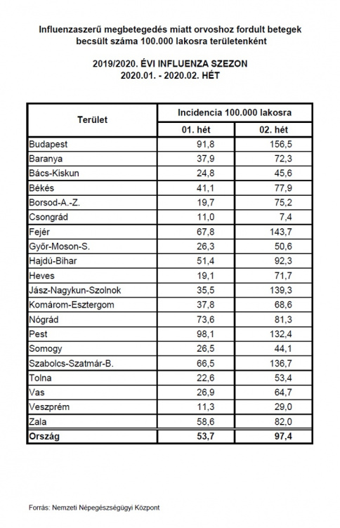 Az első héten 100 000 lakos közül 97 beteg fordult orvoshoz influenzaszerű megbetegedés miatt, az incidencia 97,4%ooo-nek bizonyult. Laboratóriumi vizsgálattal igazolt, influenzavírus által okozott megbetegedéseket Budapest, Békés és Vas megyében diagnosztizáltak.