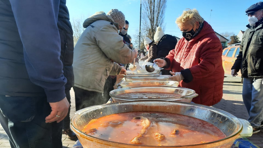 Huszonöt önkéntes dolgozott azon, hogy a halászlévendégség tökéletes legyen, valamennyien maszkban, kesztyűben tüsténkedtek, betartva a vírus elleni védekezés szabályait. A csomagokban a halászlén kívül friss kenyeret adtak át a Soós Pékség jóvoltából és bejglit a Pataki Cukrászda felajánlásának köszönhetően.