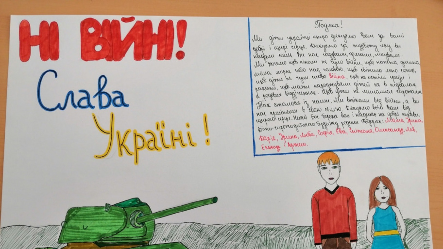 "Mi, ukrajnai gyerekek hálásan köszönjük az Önök kedvességét, jószívűségét. Köszönjük a sok türelmet, amit kaptunk Önöktől. Köszönjük az ételt, a ruhákat, és hogy gyógyítottak, ha kellett. Mi azt szeretnénk, ha soha nem lenne háború, hogy minden gyerek feje fölött békés legyen az ég, vidáman süssön a nap, s hogy a gyerekek soha ne hallják azt a szót, hogy háború, hogy ne rakétázzanak és bombázzanak, hogy az anyák gyerekeket szüljenek, ne pedig temetni kelljen őket, s hogy a gyerekek ne maradjanak árván. Velünk ez történt. Mi elszöktünk a háború elől, és Önök befogadtak minket a családjaikba. Nagyon hálásak vagyunk Önöknek ezért. Isten áldja és óvja mindannyiukat! A Fedorjak-család árvaházi gyerekei: Irina mama, Daria, Irina,Ljuba, Szofia, Éva, Snizhana, Olekszandr, Lev, Elnur és Artem"