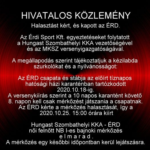 A versenykiírás szerint a 10 napos karantént követő 8. napon kell csak mérkőzést játszania az ÉRD női kézilabda csapatának, akik október 18-áig karanténban voltak. Az Érdi Sport Kft. ezért kérte az október 25. 15 órára kiírt bajnoki mérkőzés halasztását, amit a Szombathely elfogadott.