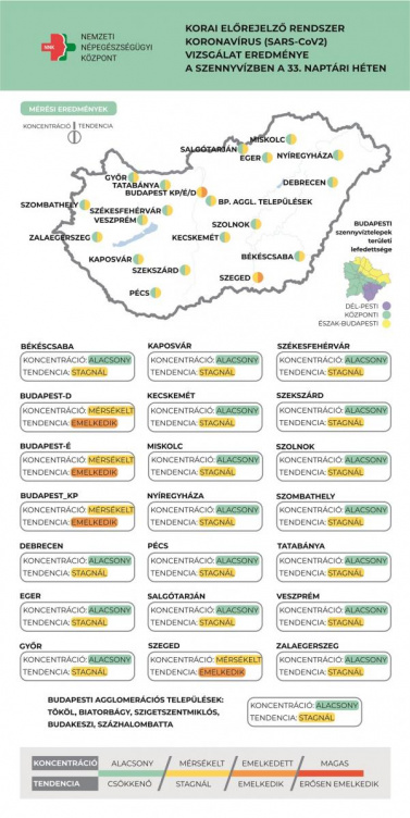A 33. héten a szennyvízminták koronavírus eredménye országos átlagban emelkedő tendenciát mutat, a SARS-CoV-2 koncentrációk megegyeznek a második hullám felszálló ágában mértekkel – tájékoztat az NNK.