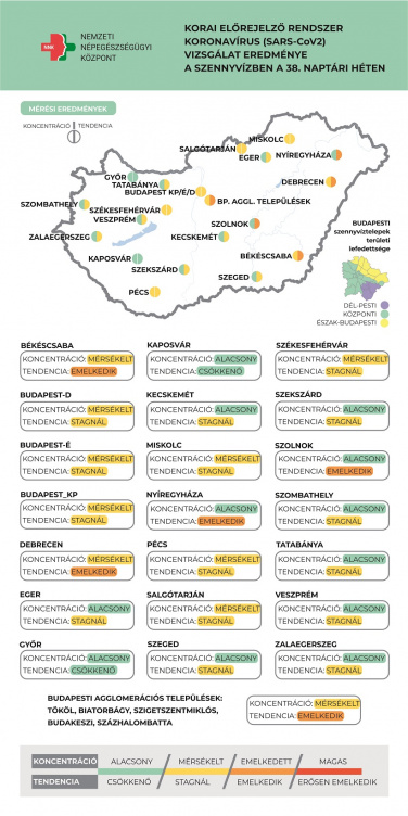 A szennyvízminták SARS-CoV-2 vírus-koncentrációja több hét távlatában lassú emelkedést mutat. A vizsgált magyarországi városok többségét stagnáló tendencia jellemzi. Enyhe emelkedés látható Békéscsabán, Debrecenben, Nyíregyházán, Szolnokon, valamint a Budapest környéki agglomerációs települések (Tököl, Biatorbágy, Szigetszentmiklós, Budakeszi, Százhalombatta) közös mintájában. Csökkenés Győrött és Kaposváron figyelhető meg. A vizsgált helyszínek közül 12 minta koncentrációja az alacsony tartományba, míg 10 minta a mérsékelt tartományba esik.