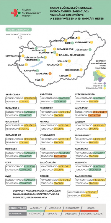 A 19. héten a szennyvízmintákban mért SARS-CoV-2 koncentráció országos átlaga enyhe csökkenést mutat. A legtöbb település mintájában a vírus-koncentráció stagnál, csökkenő tendencia Debrecenben, Egerben, Győrben, Kaposváron, Veszprémben, és kisebb mértékben Budapesten tapasztalható. Ezzel szemben Szekszárdon és enyhébb mértékben Pécsett emelkedő a tendencia. A koronavírus-koncentráció 9 helyen alacsony, 12 helyen mérsékelt, és egy mintavételi helyen az emelkedett kategóriába sorolható.