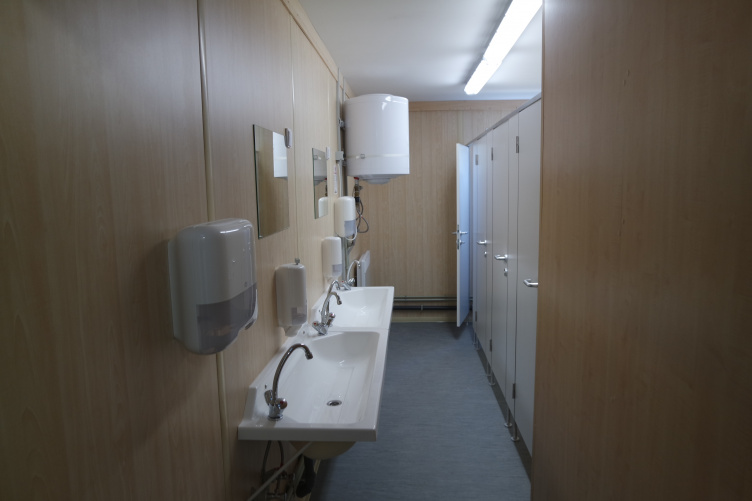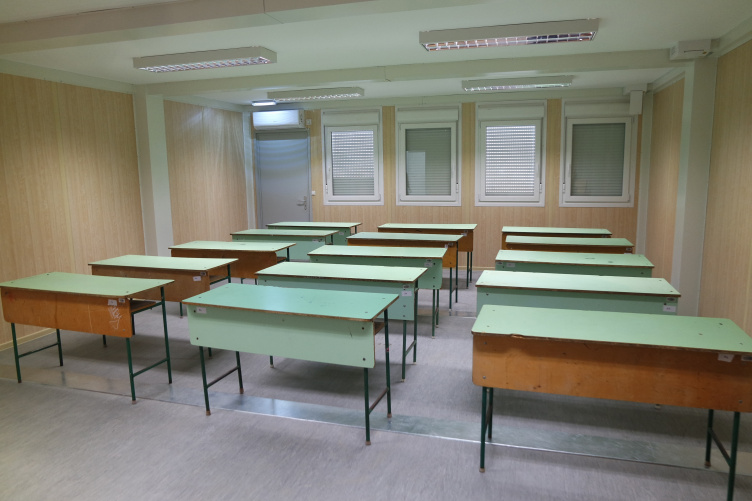 A három, különböző szinten, de egymás mellett álló konténerben légkondicionált, fűthető, redőnyös ablakú tantermek, valamint kiszolgálóhelyiségek és tanári szobák is helyet kaptak.