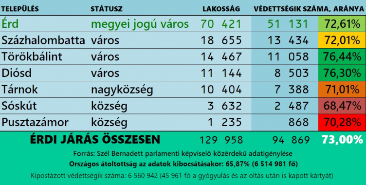 Érden a 70421 lakosból 51131 fő jutott védettségi igazolványhoz, így közel 73%-os védettséget jelent. Ami a szomszédos településeket illeti, Százhalombattán a lakosság 72%-a, Dióson és Törökbálinton 76%-a kapott védettségi igazolványt, míg ez az arány Sóskúton 78, Tárnokon 71, Pusztazámor pedig 70%. Így az érdi járásban összesen 73% az átoltottság.