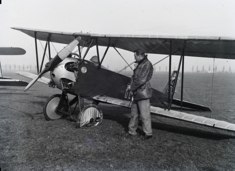 A sérült kerekű Lampich L-4/60 Bohóc típusú repülőgép előtt a táborparancsnok Endresz György pilóta, főoktató,1929.