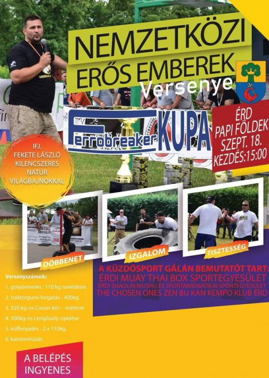 Nemzetközi Erős Emberek Versenyét rendeznek szeptember 18-án, 15 órától Érden, a Papi Földeken. A Ferrobreaker Kupán a sportolók hat versenyszámban mérik össze tudásukat. Az eseményre a belépés ingyenes.