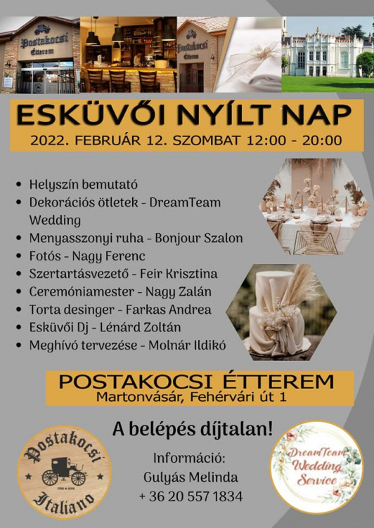 Február 12-én szombaton 12 és 20 óra között esküvői nyílt napot rendeznek Martonvásáron, melyre ingyenes a belépés. Az eseményen a menyasszonyi ruhák és dekorációs ötletek bemutatása mellett a meghívívók tervezéséről is szó esik.