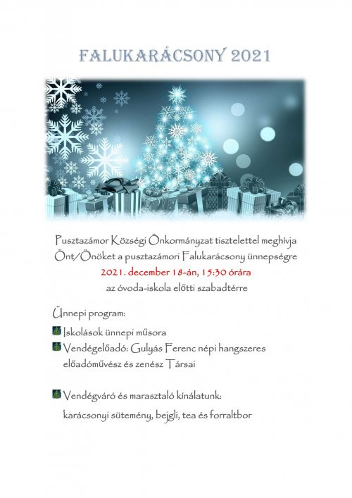 A Pusztazámor Községi Önkormányzat Képviselő-testülete ez évben is megrendezi a Falukarácsonyt, melyre szeretettel hív és vár minden pusztazámori lakost. Az ünnepséget december 18-án 15.30-as kezdettel rendezik meg az óvóda és az iskola előtt, szabadtéren.