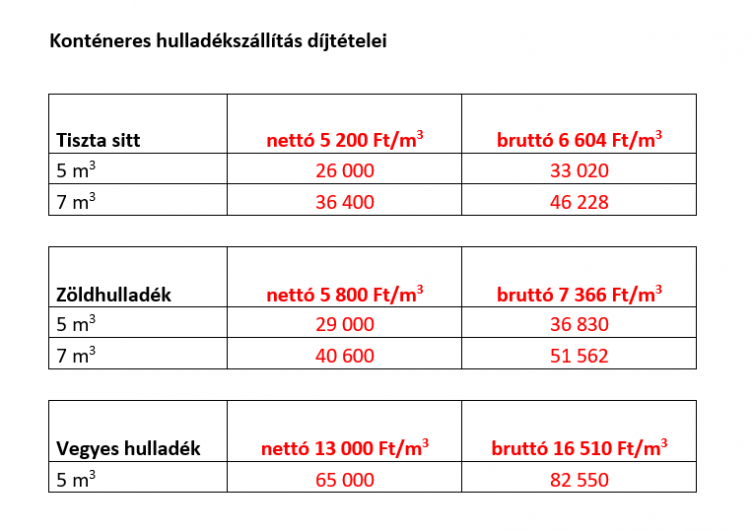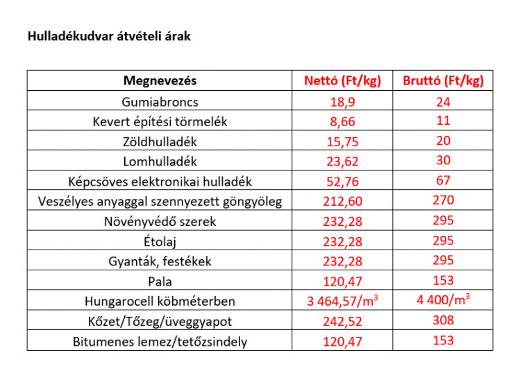 A szolgáltató részletezte a különböző hulladékok átvételi árait is.