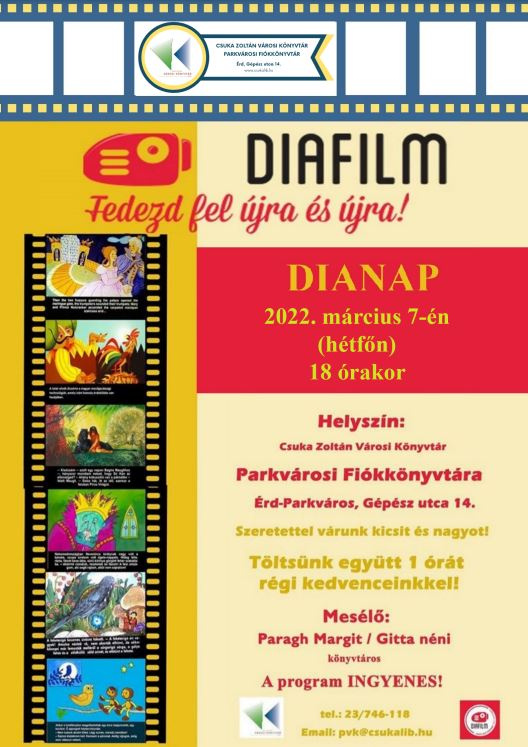 2022. március 7-én, hétfőn 18 órától Dianapot tart a Csuka Zoltán Város Könyvtár Parkvárosi Fiókkönyvtára (2030 Érd, Gépész utca 14., Parkvárosi Közösségi Ház). Az ingyenes programon Paragh Margit, Gitta néni mesélőként kalauzolja el a kicsiket és nagyokat régi kedvenc meséinkkel, diákon keresztül.