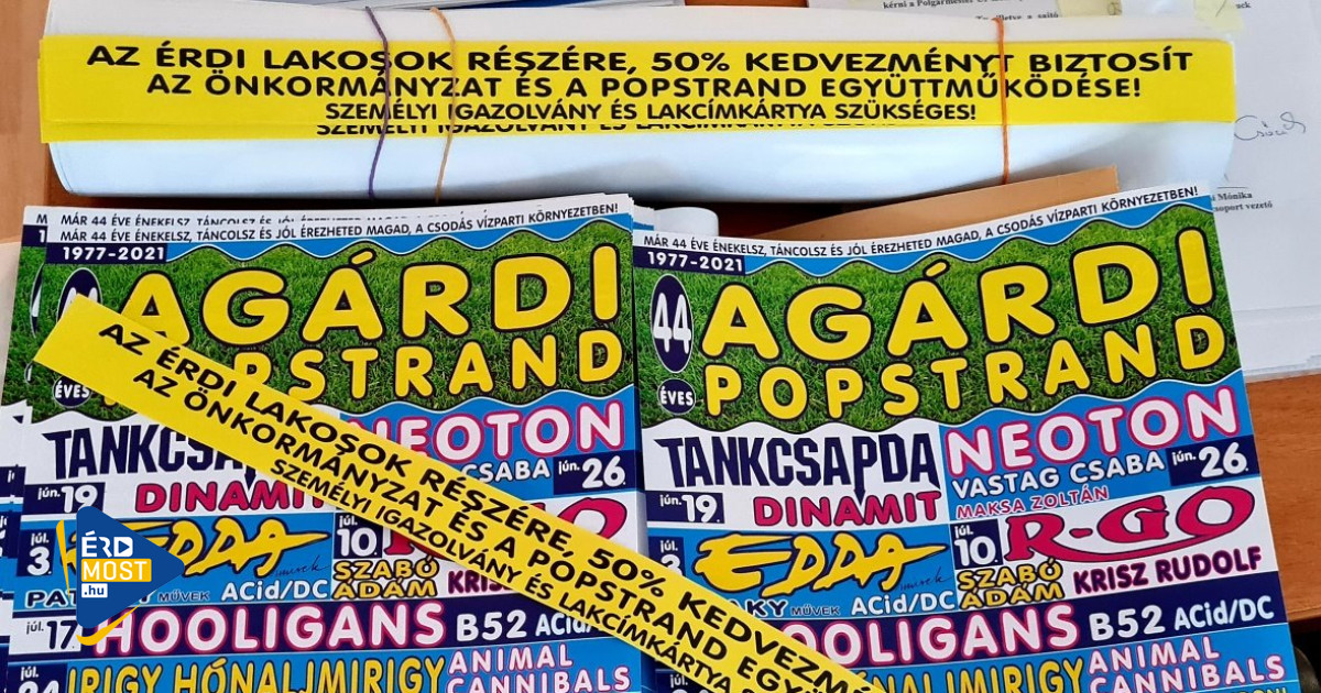 KözéletSzabadidő2021. június 17. 19:26erdmost.huFél áron AgárdonAz elmúlt évekhez hasonlóan idén is féláron válthatnak jegyet az Agárdi Popstrandra és koncertjeire az érdi lakcímkártyával rendelkezők - számolt be róla közösségi oldalán Csőzik László, Érd polgármestere.