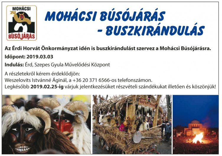 Városnaplófelhívás2019. február 04. 11:35erdmost.huFelhívás: buszkirándulás Mohácsra, a busójárásra.Az Érdi Horvát Önkormányzat idén is buszkirándulást szervez Mohácsra a busójárás idején.