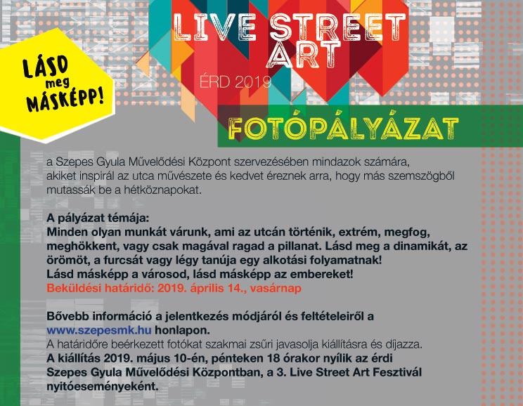 Városnaplófelhívás2019. március 29. 14:18erdmost.huFelhívás: Lásd meg másképp! fotópályázatA Live Street Art fotópályázata