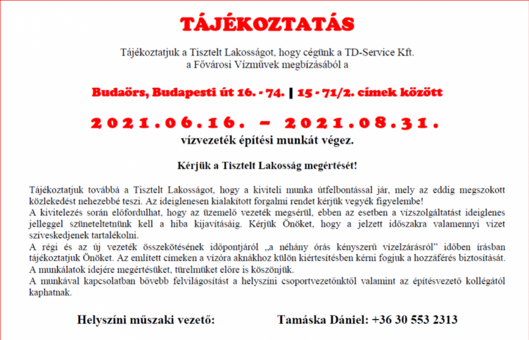 A Fővárosi Vízművek megbízásából vízvezeték építési munkálatok kezdődtek június 16-án a Budaörsön, Budapesti út egyes részein. A munka augusztus 31-éig tartanak és útfelbontással jár, mely az eddig megszokott közlekedést nehezebbé teszi, erre az időre ideiglenes forgalmi rendet alakítottak ki.