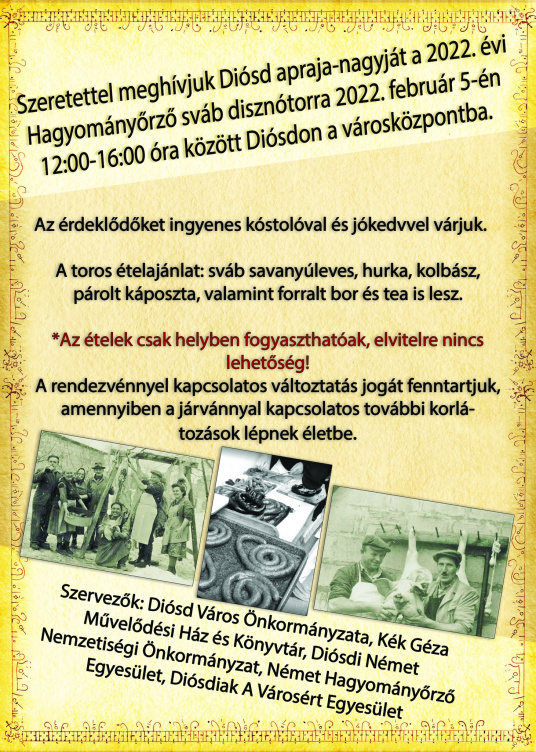 érdekesKultúra2022. január 31. 13:01erdmost.huHagyományőrző sváb disznótoros DiósdonFebruár 5-én 12 és 16 óra között hagyományőrző sváb disznótort rendez a diósdi önkormányzat, a nemzetiségi önkormányzat, a művelődési ház, két civil szervezettel együttműködve.Az érdeklődőket ingyenes kóstolóval és jókedvvel várják.