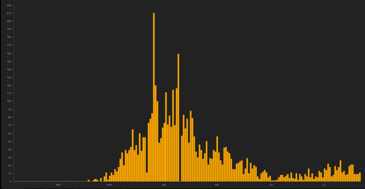 Képünkön a Johns Hopkins Egyetem grafikonja látható, amely a napi fertőzöttséget mutatja, Magyarországon (az utolsó adat a tegnapi):