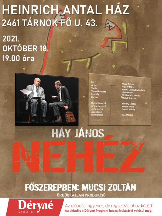KultúraTárnok2021. október 05. 17:32erdmost.huHáy János: Nehéz – október 18-án előadás TárnokonOktóber 18-án 19 órától Mucsi Zoltán főszereplésével Háy János: Nehéz című darabját adják elő a tárnoki Heinrich Antal Házban (2461 Tárnok, Fő utca 43.). Az előadás ingyenes, de regisztrációhoz kötött.forrás: Tárnoki Közösségi Színtér