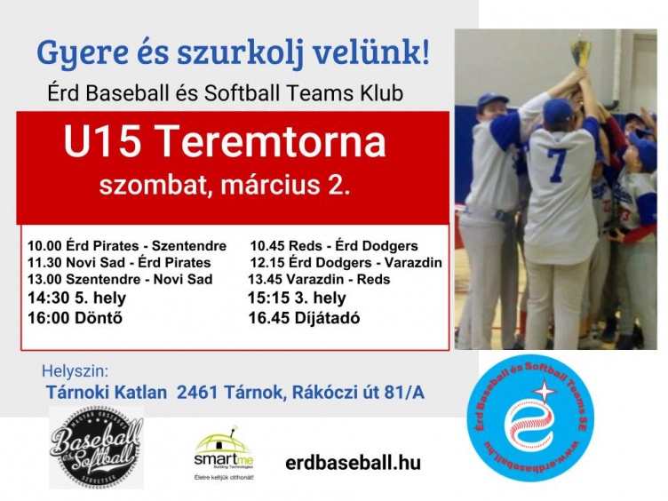 Teremtornát rendez Tárnokon az Érdi Baseball Team. A bajnoki szezon megkezdése előtt az U15-ös korosztály számára tart nemzetközi tornát az egyesület, ahol az Érdi Pirates és az Érd Dodgers mellett az Újvidék, a Varasd, a Reds és a Szentendre együttesei vesznek részt. A Tárnoki Katlanban rendezendő esemény küzdelmei délelőtt 10 órakor kezdődnek, a döntő pedig 16 órakor.