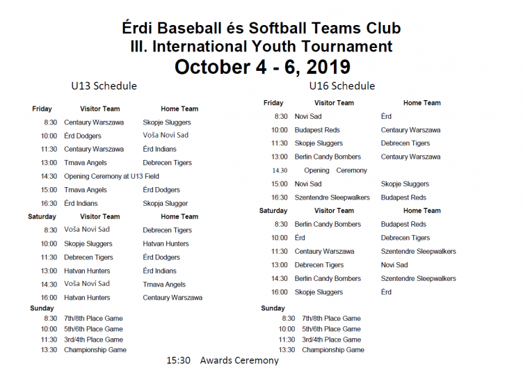 Rangos torna Érden! Idén már harmadszor rendezi meg nemzetközi tornáját az Érdi Baseball és Softball Club, amely október 4-én, 14.30-tól tart kupát. A viadalon az U13-as korosztályban az Érd Indians és Érd Dodgers mellett többek között lengyel, macedón, szerb és szlovák csapatok is részt vesznek, míg az U16-osoknál az érdiek egy csapata mellett itt is lesz szerb, lengyel, macedón, sőt, még német csapat is a mezőnyben. A korosztályok döntői vasárnap 13.30-kor kezdődnek a Mecset utcai pályán.