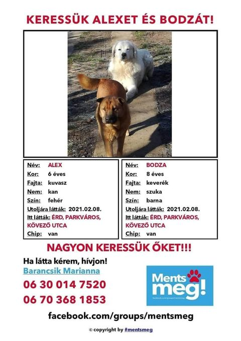 A kutyusok gazdája kórházba került, a két kutya feltehetőleg az idős néni megkeresésére indult. Talán a sok megosztásnak is köszönhető, hogy Alex azóta megkerült, de Bodzát továbbra is kétségbeesetten keresi a család. Kérik, hogy ha látják a képen szereplő Bodza névre hallgató, barna színű kutyust, haladéktalanul hívják a megadott telefonszámok egyikét!