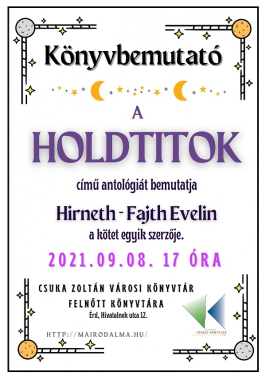 KözéletSzabadidőKultúra2021. szeptember 08. 08:31erdmost.huA holdtitok – könyvbemutató a könyvtárban2021. szeptember 8-án, 17 órakor Hirneth-Fajth Evelinnel, a Holdtitok című antológia egyik szerzőjével tartanak könyvbemutatót a Csuka Zoltán Városi Könyvtár felnőtt könyvtárában (Érd, Hivatalnok utca 12.).forrás: csukalib.hu