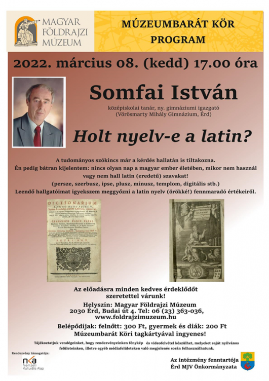 2022. március 8-án, kedden 17 órától Somfai István, a Vörösmarty Mihály Gimnázium tanára tart előadást a Magyar Földrajzi Múzeumban Holt nyelv-e a latin? címmel.