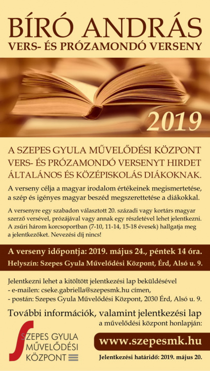 A versenyre május 24. (péntek) 14 órakor kerül majd sor, helyszíne a Szepes Gyula Művelődési Központ lesz. Jelentkezni a kitöltött, aláírt jelentkezési lappal lehet. Cím: cseke.gabriella@szepesmk.hu, vagy postai úton Szepes Gyula Művelődési Központ, 2030 Érd, Alsó u. 9. A jelentkezési lap személyesen is leadható a művelődési központban Cseke Gabriella nevére.