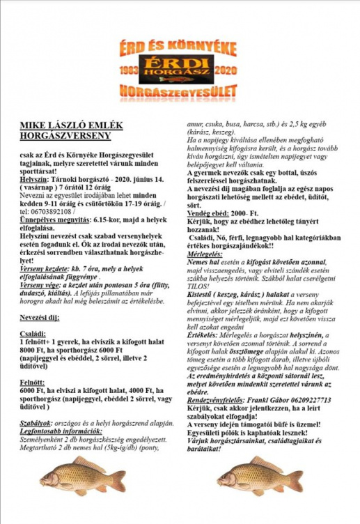 Idén június 14-én, vasárnap kerül sor a horgászversenyre. A tagok előzetesen az egyesület irodájában nevezhetnek kedden 9-11, csütörtökön pedig 17-19 óra között, illetve telefonon, a 0670389-2108-as telefonszámon. (A helyszínen csak a szabad helyek függvényében fogadnak el nevezést a szervezők.)