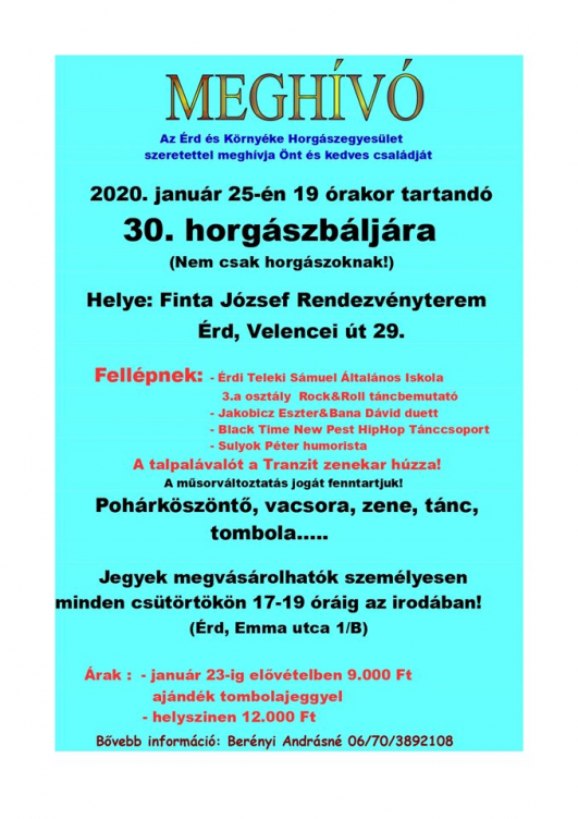 Az egyesület idén szeretné folytatni a fenti, már bevált programokat, illetve megtartani a kedvelt rendezvényeiket, emellett felélesztenék a horgászbál hagyományát is – az idei lesz a harmincadik ilyen rendezvény, amit hosszú kihagyás után rendeznek meg. Ezt jövő szombaton tartják, és nem csupán a horgászokat, hanem mindenkit sok szeretettel várnak rá, aki szeretne jó hangulatban eltölteni egy estét (előzetes jelentkezés szükséges, részletek az alábbi plakáton).