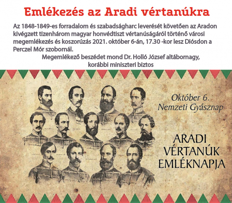 Diósdon a városi megemlékezést és koszorúzást 17.30-tól tartják a Perczel Mór szobornál. Az eseményen megemlékező beszédet mond Dr. Holló József altábornagy, korábbi miniszteri biztos.